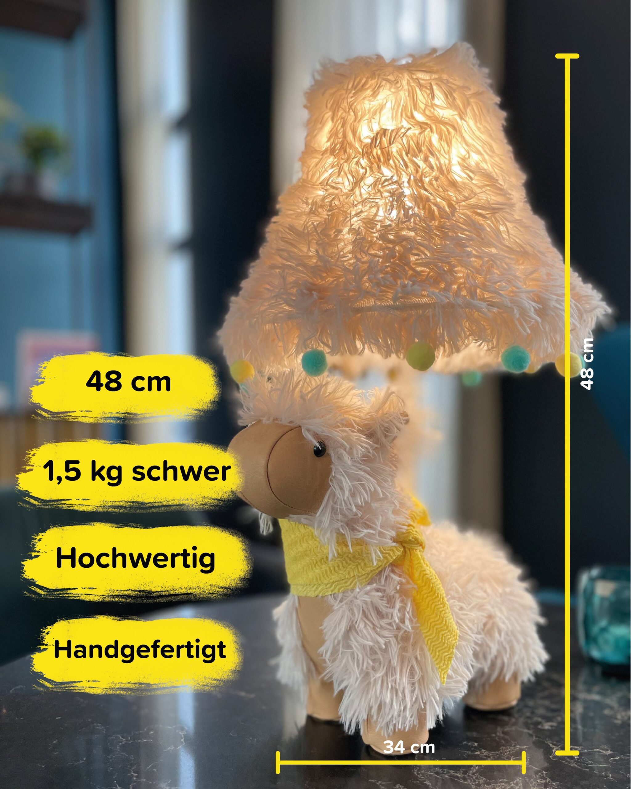 Alpakas sind süß und flauschig, so auch Alma. Mit Ihrem kuscheligen Fell und den süßen Bommeln am Lampenschirm ist Sie einfach ein Hingucker. Mit ihrem unvergleichbar flauschigen Auftreten zaubert Sie dir immer wieder ein Lächeln ins Gesicht. Alpakas sind sehr friedliche und sanfte Wesen, die es gerne haben in einer Gruppe zu leben. So wird es Alma lieben dir bei all deinen täglichen Aufgaben zu Hause oder auch im Büro nicht von der Seite zu weichen.. Das macht Alma besonders. Alma hebt sich mit Ihrem einzigartigen flauschigen Stoff von allen Lampen ab. Durch ihre beige Farbe passt sie sich super an alle Räumlichkeiten an. Ihr flauschiges Fell in Verbindung mit ihren Knopfaugen und dem süßen Halstuch zaubert Alma allen Menschen, egal ob groß oder klein, ein Lächeln aufs Gesicht. Zudem erzeugt der einzigartige Lampenschirm eine ganz besonders gemütliche Lichtfarbe.. Einsatzgebiet. Alma ist eine Tischlampe und fühlt sich in allen Räumlichkeiten pudelwohl. Egal, ob sie auf der Kommode im Flur oder als Dekolampe auf einem kleinen Tisch neben der Couch steht, Alma ist überall ein Hingucker. Abends setzt sie sich auch gerne neben dein Bett und macht dir ein tolles Licht vor dem einschlafen.. Happy Lamps. Unsere Happy Lamps in Stofftieroptik sind nach höchstem Standard durch das renommierte Testinstitut „Hansecontrol“ sicherheitszertifiziert. Sie werden in Handarbeit hergestellt und bestechen durch ihr exklusives Produktdesign. Schaue dir gerne unsere weiteren einzigartigen Modelle an. In unserem Onlineshop findest du die komplette Happy Family und kannst dir deinen Liebling direkt nach Hause bestellen.