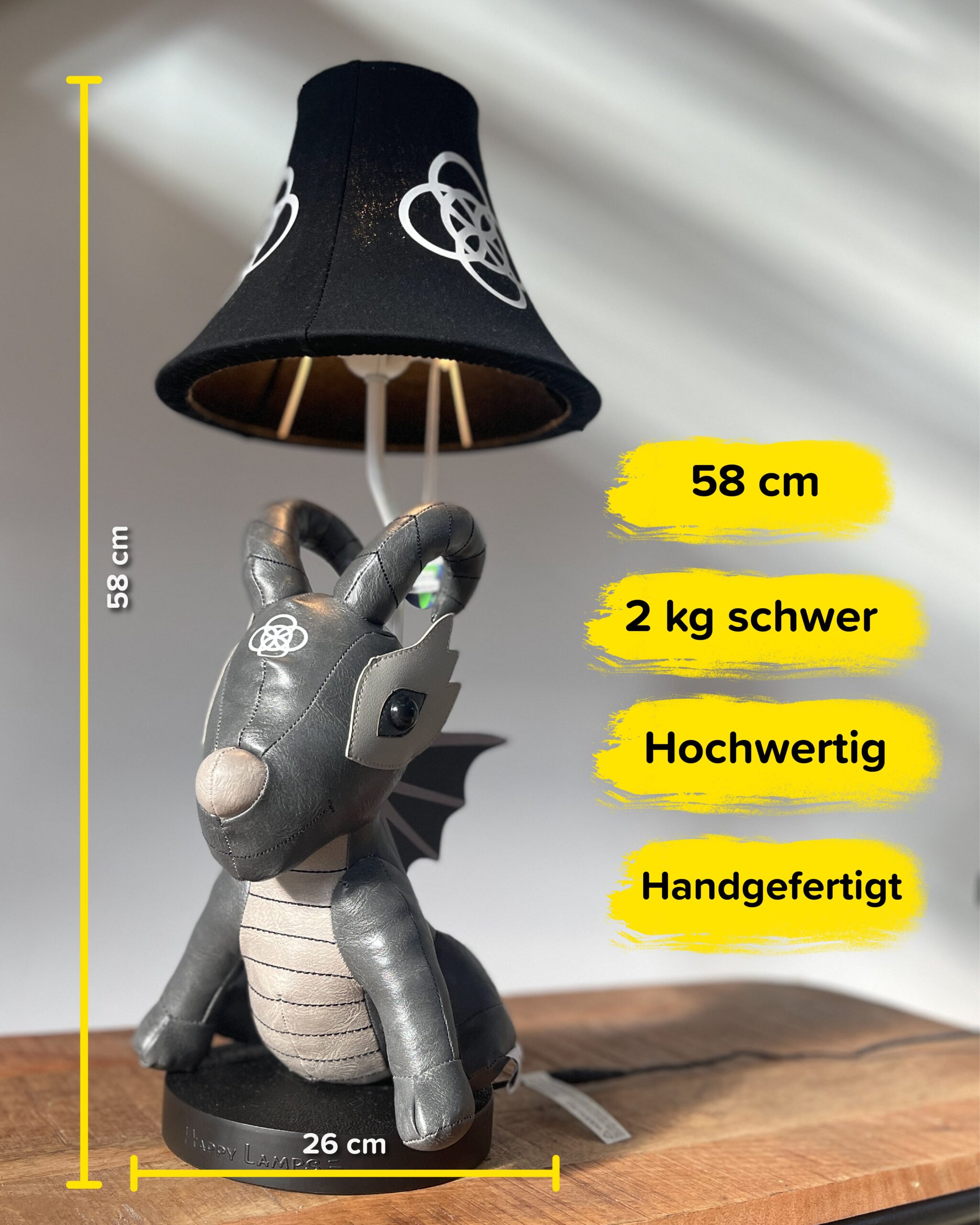 BLACK DRAGON – Die furchtlose, dekorative LED-Leuchte. Unsere neue, handgefertigte Black Dragon LED-Leuchte kombiniert einzigartige Handwerkskunst mit kraftvollem Design. Mit seinem imposanten Aussehen verkörpert der Black Dragon die Essenz von Furchtlosigkeit und Eleganz. Diese dekorative Lampe ist weit mehr als nur ein Beleuchtungsobjekt – sie ist ein faszinierender Blickfang in jedem Raum.. Handgefertigte LED-Leuchte mit Drachendesign. Der Black Dragon wird sorgfältig in aufwendiger Handarbeit hergestellt, und seine detailreiche Gestaltung offenbart bei genauer Betrachtung immer neue Facetten. Trotz seiner majestätischen Erscheinung bringt der Black Dragon nicht nur eine mystische Atmosphäre, sondern auch ein warmes, angenehmes Licht, das jede Umgebung in ein gemütliches Ambiente taucht.. Einzigartiges Design für stilvolle Dekoration. Die auffälligen Drachenschwingen und das markante Design machen diese LED-Leuchte zu einem unverwechselbaren Einrichtungsstück, das Blicke auf sich zieht und Dein Zuhause stilvoll aufwertet. Ob im Kinderzimmer, im Büro oder im Hobbyzimmer – der Black Dragon thront majestätisch und sorgt für das gewisse Etwas in der Einrichtung.. Ein Leuchtobjekt, das gute Laune verbreitet. Lass Dich nicht von seiner imposanten Erscheinung täuschen – der Black Dragon ist ein Symbol der guten Laune und verleiht jedem Raum einen Hauch von Magie. Als stolzer Besitzer wirst Du das furchtlose Herz dieses dekorativen Leuchtobjekts erobern und von seiner einzigartigen Ausstrahlung begeistert sein.. Happy Lamps. Unsere Happy Lamps in Stofftieroptik sind nach höchstem Standard durch das renommierte Testinstitut „Hansecontrol“ sicherheitszertifiziert. Sie werden in Handarbeit hergestellt und bestechen durch ihr exklusives Produktdesign. Schaue dir gerne unsere weiteren einzigartigen Modelle an. In unserem Onlineshop findest du die komplette Happy Family und kannst dir deinen Liebling direkt nach Hause bestellen.