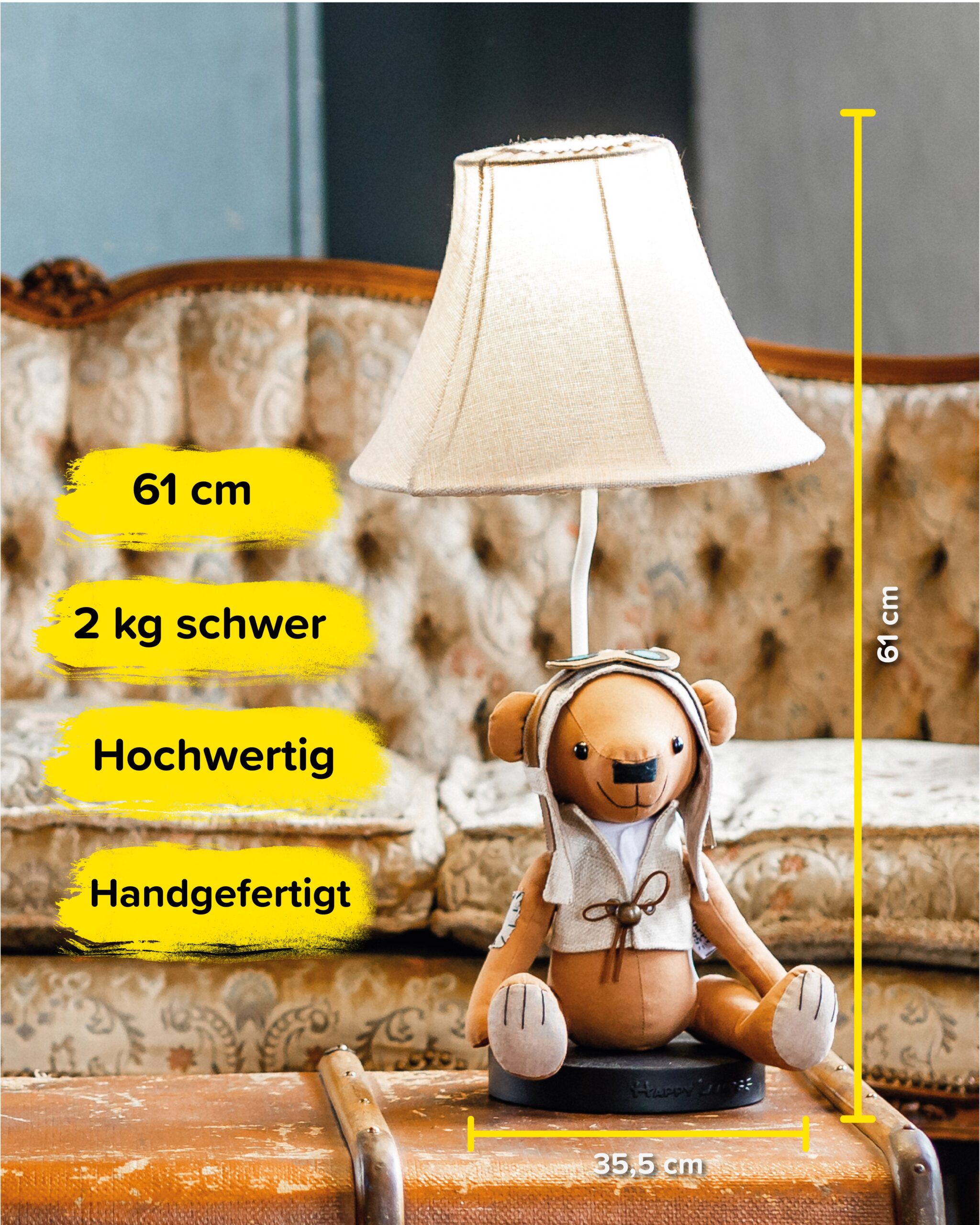 Charles besticht durch seinen goldigen Look und Charme. Das Licht von Charles strahlt das Selbstbewusstsein eines Piloten aus. Wusstest du, dass Charles ein echter Held ist? Als Erster überquerte Charles in einem Nonstopflug den Atlantik von New York nach Paris. Er ist also nicht nur super süß, sondern auch noch mutig und strahlt positive Energie aus. Lass auch du dich von seiner positiven Aura inspirieren und mitreis(s)en. Charles ist einfach ein bärenstarker Typ.. Das macht Charles besonders. Charles ist bestens ausgerüstet: Seine Pilotenjacke hält ihn warm und seine Pilotenbrille trägt er stets einsatzbereit auf seinem Kopf. Dabei sitzt er auf einer schwarzen Bodenplatte mit dezenter „Happy Lamps“ Prägung. Seinen rechten Arm ziert ein kleiner Flicken, der von seiner Atlantiküberquerung stammt. Durch seine hochgezogenen Mundwinkel könnte man meinen, Charles sei dauerhaft am Lächeln. Davon kannst du dich anstecken lassen – wie? Ganz einfach: Charles jeden Tag anschauen und einfach mitlächeln.. Einsatzgebiet. Genauso vielseitig wie sein Charakter ist Charles’ Platzwahl, denn er ist ein Weltenbummler. Trotzdem braucht auch er einmal eine Pause und kann nicht ständig unterwegs sein, möchte aber dennoch einiges mitbekommen. Daher eignet er sich hervorragend als Tischlampe, zum Beispiel auf deiner Wohnzimmer-Kommode, deinem Nachttisch oder auch als Schreibtischlampe im Büro. Aber ganz egal, wo er steht – er ist immer bereit für das nächste Abenteuer und um dich happy zu machen.. Happy Lamps. Unsere Happy Lamps in Stofftieroptik sind nach höchstem Standard durch das renommierte Testinstitut „Hansecontrol“ sicherheitszertifiziert. Sie werden in Handarbeit hergestellt und bestechen durch ihr exklusives Produktdesign. Schaue dir gerne unsere weiteren einzigartigen Modelle an. In unserem Onlineshop findest du die komplette Happy Family und kannst dir deinen Liebling direkt nach Hause bestellen.