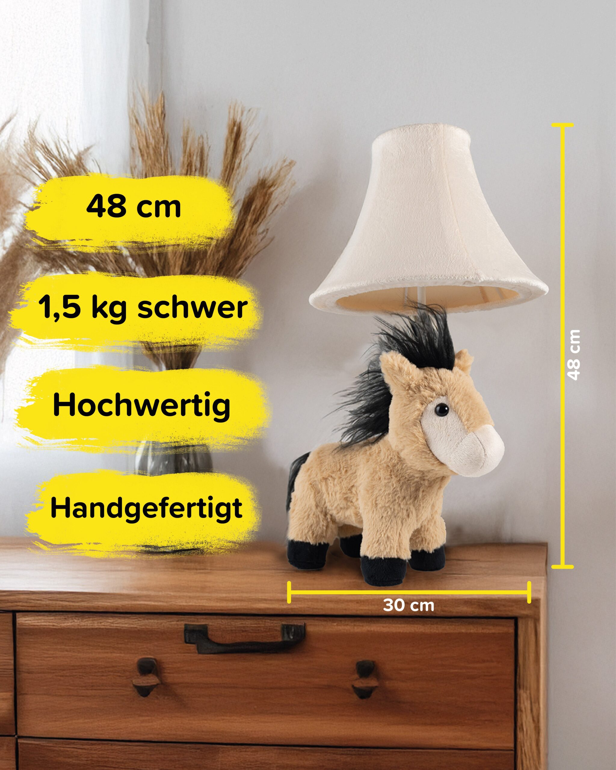 Happy Elvis ist kein gewöhnliches Pferd – er ist ein echter Charakter! Mit seinem verschmitzten Blick, der wilden Mähne und einem stets gut gelaunten Gemüt ist Elvis der frechste Hengst der Happy Family. Er ist immer für einen Spaß zu haben und bringt jede Menge Schwung in deinen Alltag.. Ob wilde Ideen oder spontane Tanzeinlagen – Elvis ist mittendrin. Er liebt das Rampenlicht und scheut sich nicht davor, auch mal aus der Reihe zu tanzen. Kein Wunder also, dass man sich in seiner Gegenwart ein bisschen wie ein Rockstar fühlt.. Das macht Elvis besonders. Elvis wird aus hochwertigem, kuschelweichem Stoff gefertigt – seine Mähne ist zottelig-wild und sein Blick einfach unverwechselbar. Mit seinem verspielten Ausdruck und dem fröhlichen Wesen zieht er alle Blicke auf sich. Unter seinem Lampenschirm versteckt sich eine strahlende Seele, die dein Zuhause mit einem warmen Licht erfüllt und sofort für gute Stimmung sorgt.. Einsatzgebiet. Elvis fühlt sich überall dort wohl, wo gelacht, gelebt und geliebt wird. Ob im Kinderzimmer, auf dem Nachttisch oder als fröhlicher Farbtupfer im Büro – dieser Hengst verbreitet seine Lebensfreude, wo immer er auftaucht. Seine charmante Art bringt ein Lächeln auf dein Gesicht, selbst an grauen Tagen.. Happy Lamps. Unsere Happy Lamps in Stofftieroptik werden mit viel Liebe zum Detail in Handarbeit hergestellt und sind durch das renommierte Testinstitut „Hansecontrol“ sicherheitszertifiziert. Sie vereinen fantasievolles Design mit geprüfter Qualität und sind die perfekten Begleiter für kleine und große Lichtliebhaber.