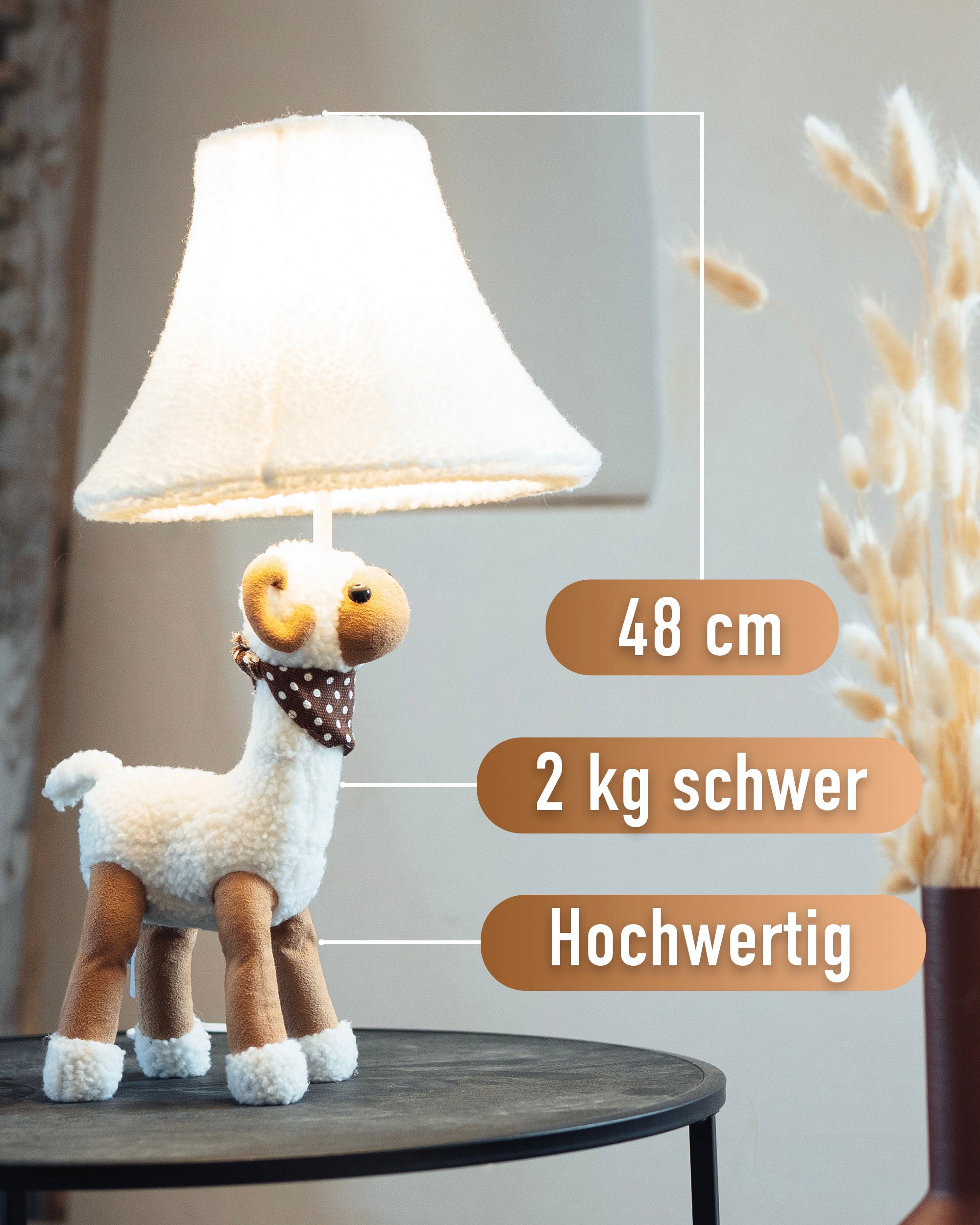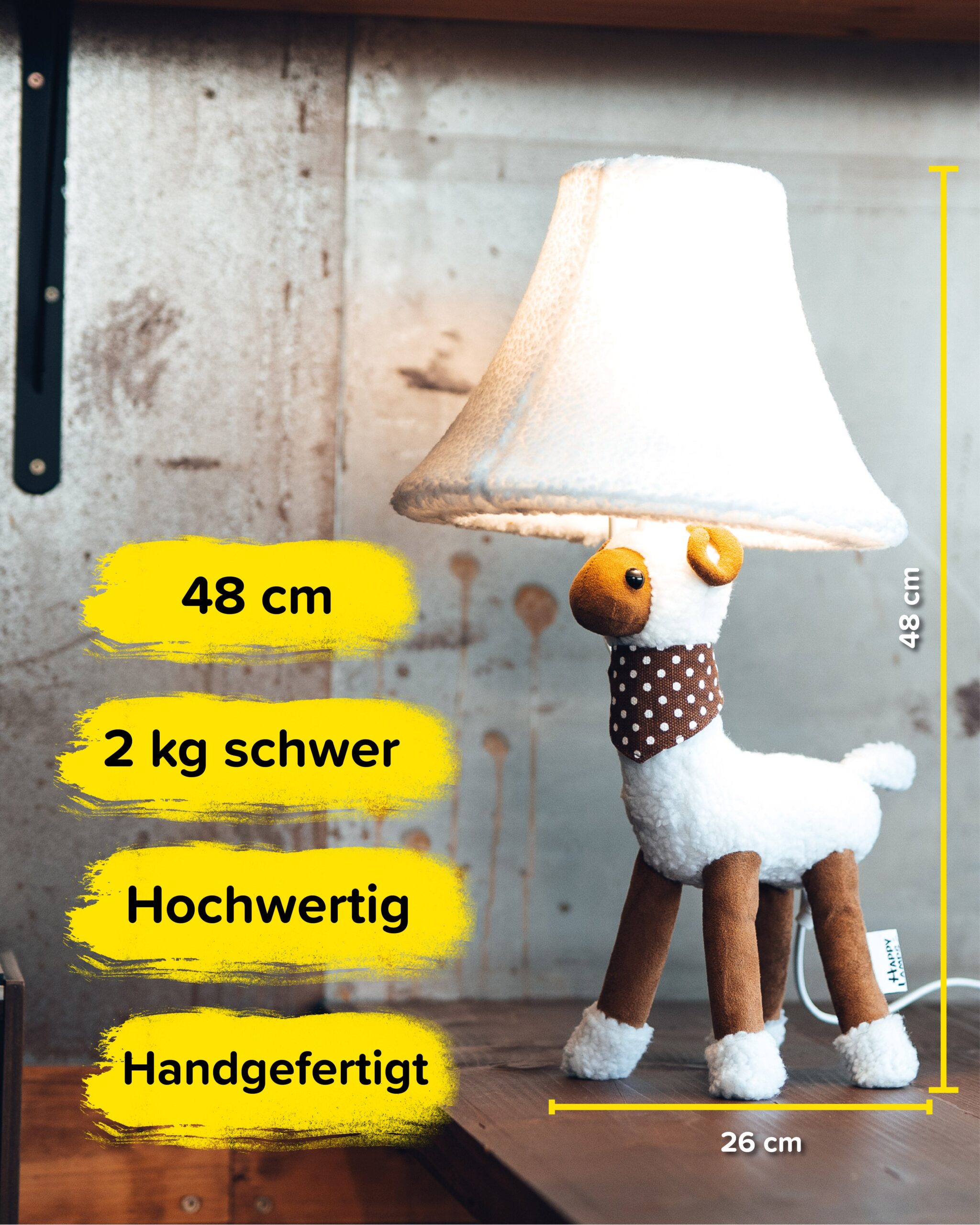 Das flauschige Schaf Wolle begeistert ausnahmslos. Vor allem, wenn er bei leichter Abenddämmerung mit seinem gemütlichen Licht den Raum erleuchtet. Er ist super süß und es gibt niemanden, der sich nicht auf den ersten Blick in ihn verliebt. Garantiert fühlt sich Wolle bei dir zuhause total wohl.. Das macht Wolle besonders. Wolle trägt ein gepunktetes Halstuch, denn er legt großen Wert auf Stil. Sein ganzer Körper ist weich und flauschig, genauso wie sein Lampenschirm und seine Füße. Das Bommelschwänzchen rundet sein süßes Erscheinungsbild ab. Durch seinen liebenswerten Blick wird Wolle im Handumdrehen dein Herz erobern.. Einsatzgebiet. Wolle fühlt sich in fast jeder Umgebung wohl. Er steht liebend gerne in Schlaf- oder Kinderzimmern, beispielsweise auf Nachttischen oder Kommoden. Aber auch in Wohnzimmern, auf Schränken oder in Eingangsbereichen hält er sich gerne auf und macht dich mit seinem angenehmen und kuschligen Licht happy.. Happy Lamps. Unsere Happy Lamps in Stofftieroptik sind nach höchstem Standard durch das renommierte Testinstitut „Hansecontrol“ sicherheitszertifiziert. Sie werden in Handarbeit hergestellt und bestechen durch ihr exklusives Produktdesign. Schaue dir gerne unsere weiteren einzigartigen Modelle an. In unserem Onlineshop findest du die komplette Happy Family und kannst dir deinen Liebling direkt nach Hause bestellen.